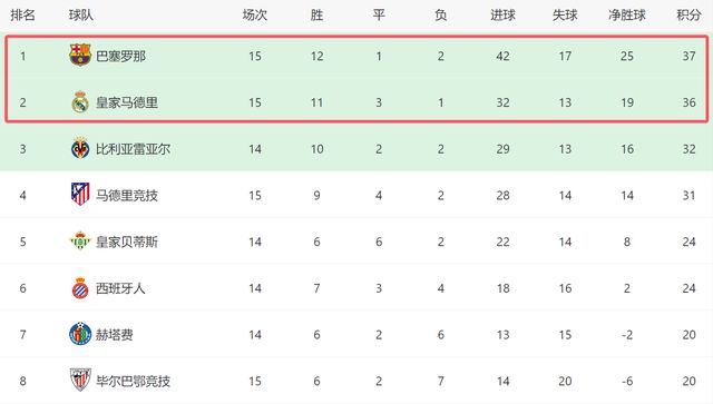 随着皇马3-0,巴萨3-1,西甲第19轮结束两场比赛,最新积分榜如下