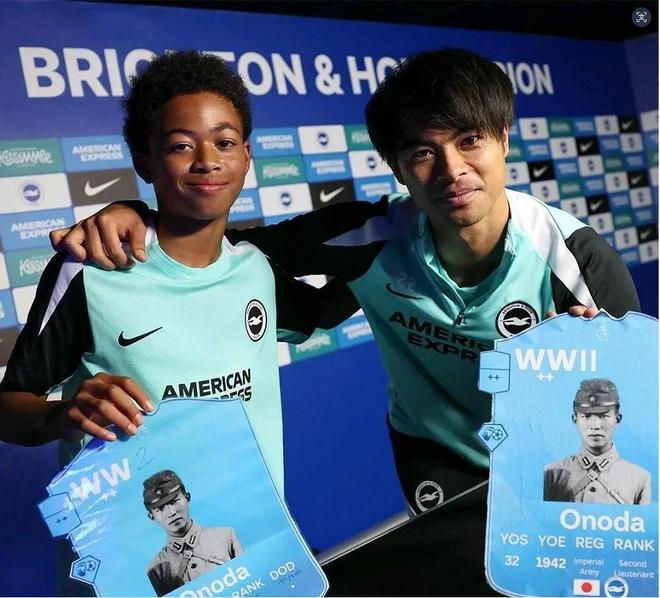 据环球时报,布莱顿俱乐部青训学院社交账号11月27日发布的一篇文章中,配上了一张小球员与三笘薰的合照,两人手持印有小野田宽郎身着军装照片的卡片。小野田宽郎是日本在二战中最后一名正式投降的士兵,在菲律宾卢邦岛杀害了30名平民,1974年才投降。