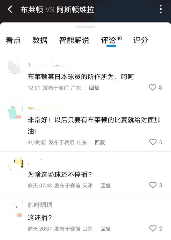 北京时间12月4日凌晨3时30分,英超第14轮开打,布莱顿队主场迎战阿斯顿维拉队。记者注意到,作为英超在中国的官方转播商,咪咕照常直播了本场比赛,这引起部分网友的不解:“为啥这场比赛不停播?”还有网友表示,以后所有比赛都给布莱顿的对手加油。